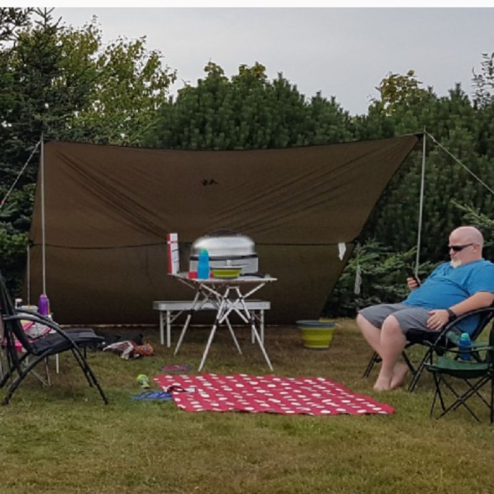 We had looked at the sky and pondered the likelihood of precipitation and concluded that a moist barbecue was a possibility. The thought of packing the mess tent and then having to not only put it up but take it down when on a pony club deadline, and with possible moisture added in to the equation, was not a pleasing prospect, so we reverted to Ray Mears mode and packed the old Decathlon tarp. KB, ably assisted by the peg twins, fashioned a windbreak/shelter/screen scenario to protect the teatime cookery. (Note the aldi bag below.)