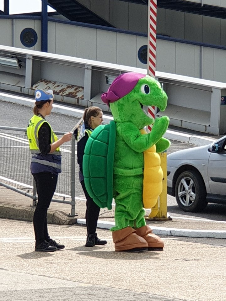 First interesting occurrence of the trip – waved aboard by a man in a turtle suit. KB rightly points out it may not have been a man, whatever, mildly unsettling.