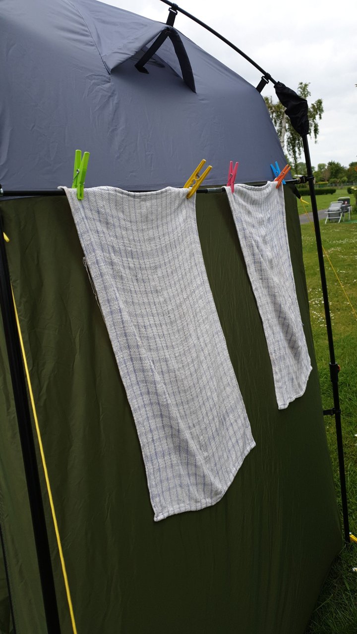It is at this point that I must sing the praises of the new John tent once again. Over the course of the week, aside from housing the Popaloo for those nocturnal necessities it has been great for storing chairs in moist conditions and the integral drying rail has been most excellent. Although I did not dabwesh.