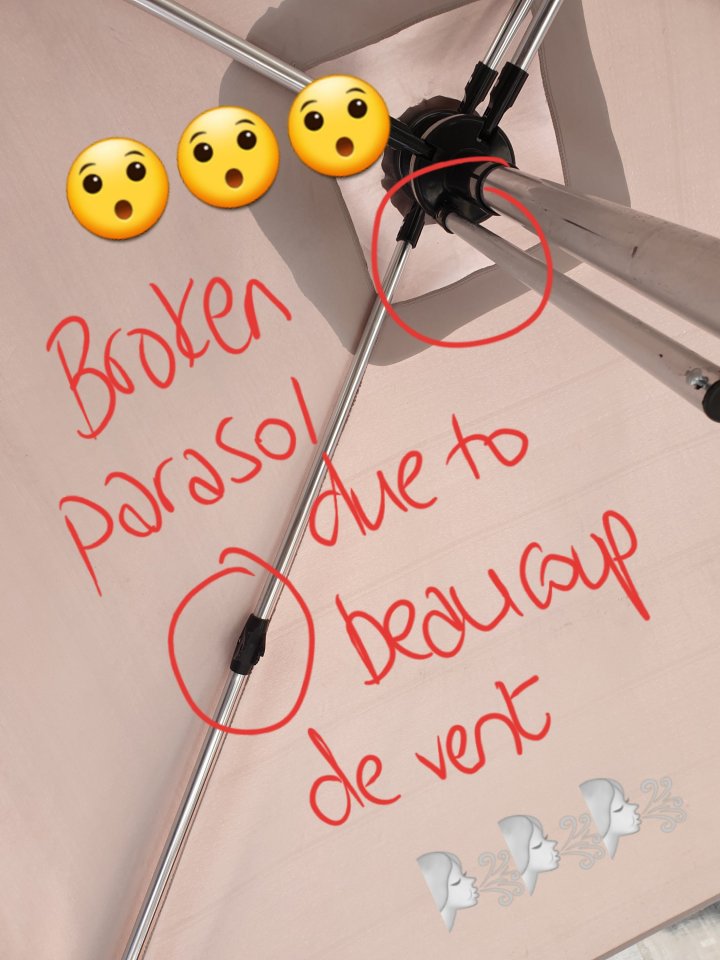 There was, what was becoming the obligatory overhead mist, and the plumbing for that, and the parasols were all lashed together in one large mass. As we were seated at the end of the installation, the wind kept getting under the parasol and lifting it. The pole was just behind me, and a couple of times I felt the need to make a grab for it to prevent it taking off. It did it anyway. And broke the parasol. Which nearly decapitated me in the process.
