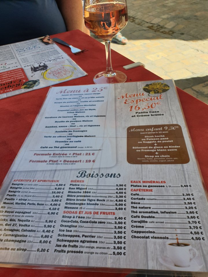 I sampled the Toro steak, and a local pink wine and although the service was slow we didn’t mind. It turns out their Sauce Aigues-Mortaise on the mussels is the standard creamy curry sauce you find in several French towns.