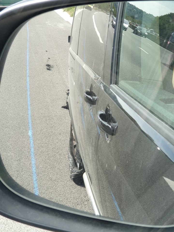Here was the problem, occurring just beyond the péage south of Lyon. We managed to pull in to the tiniest layby to assess the situation.