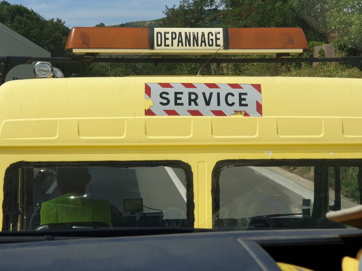 She advised me to call the motorway company who gave me a different number to call and eventually after several conversations in matter-of-fact-couldn’t-care-less kind of French a high vis man turned up with his flashing lights to protect the rear end of our vehicle from nosey nebbers getting side tracked from the business of driving.