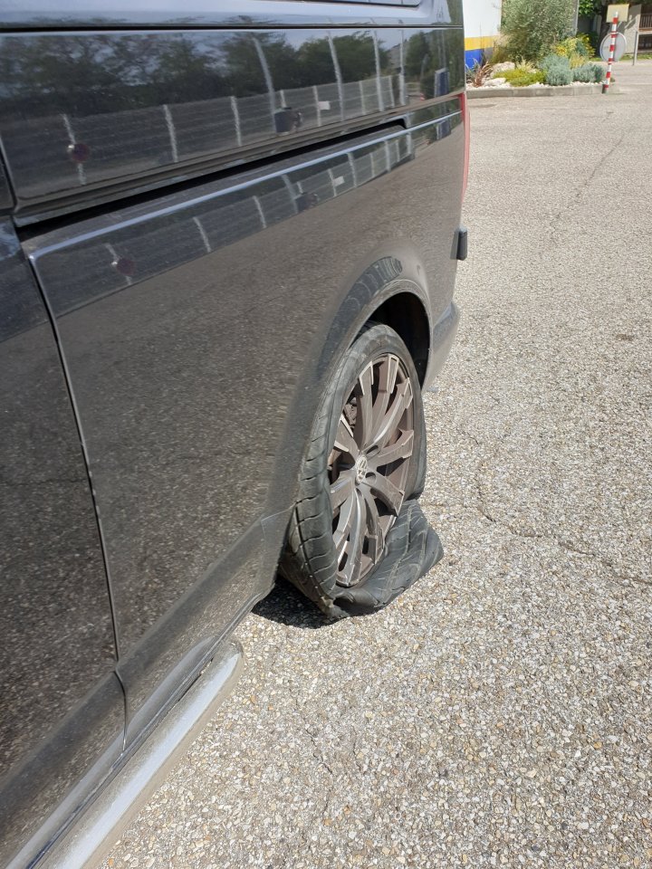 One tyre totally shredded and the dépanneur sucked his teeth when looking at the remaining wheels, commenting