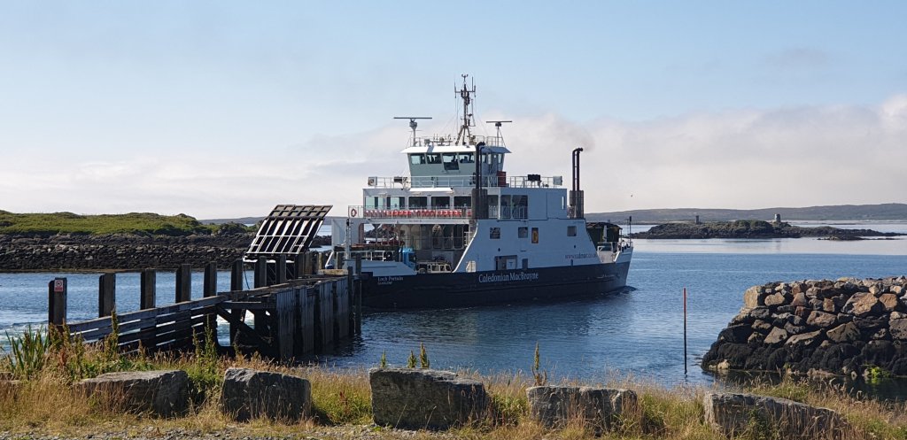 Weather was still being unpredictable in other places, but apart from a couple of showers and a stiff breeze, we experienced better than the forecast every day. High winds and rain were forecast through into Friday, but they passed us by and we had a leusurely pack up and head for the ferry. We stopped in town and bagged a round of chips and fish to eat in the ferry queue and then boarded the Loch Seaforth, bigger and swisher than the Lord of the Isles, amongst glorious sunshine and calm, millpond conditions.
