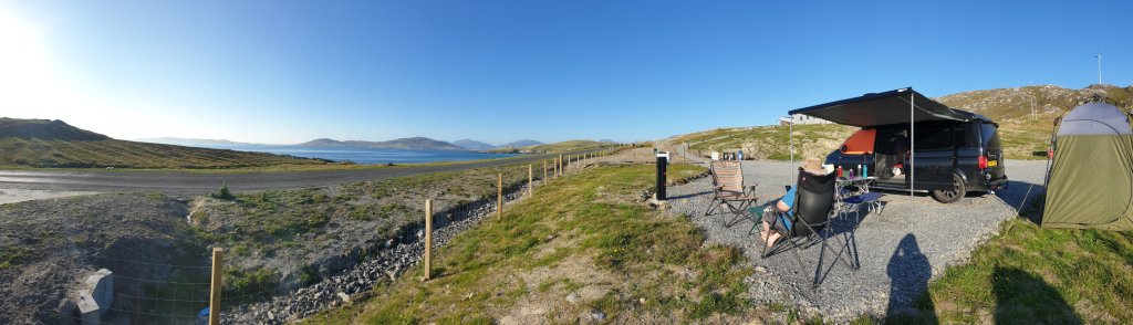 Arrived at our stop, a serviced campervan parking area called Pairc Niseaboist, £25 per night including EHU and impressive sea view, water but no other facilities. The view is what makes it, without, its just a car park with power, big, designated parking areas, but a car park nonetheless. I’d booked online after trying to get in at Traigh Horgabost camping just up the road, who told me I needed to speak to the West Harris Land Trust who managed spots for campervans. I found their website and booked online, right down to the pitch number.