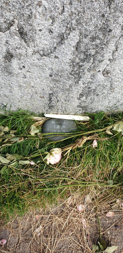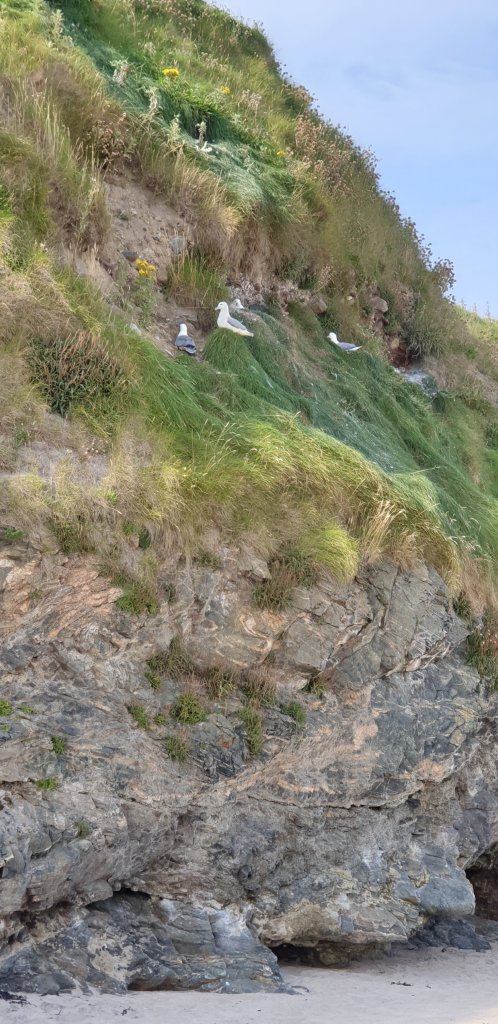 We followed the very undulating single track road for what seemed like several miles from the back end of the estuary, round the headland and when we came to the cemetery, lots of cars were parked either side of the road, so we assumed we’d better follow suit, squeezed in by the wall and set off over the hill to have a peek.
