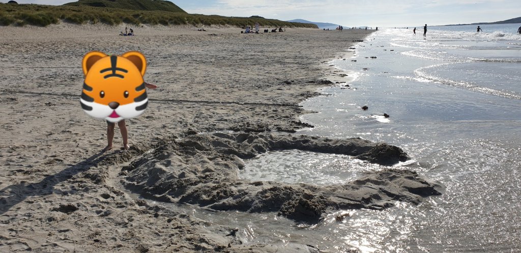 The by now obligatory jellyfish were spotted, but also a small starfish, and the smalls appropriated a ditch which someone else had created and added a moat as the tide came in to fill it.