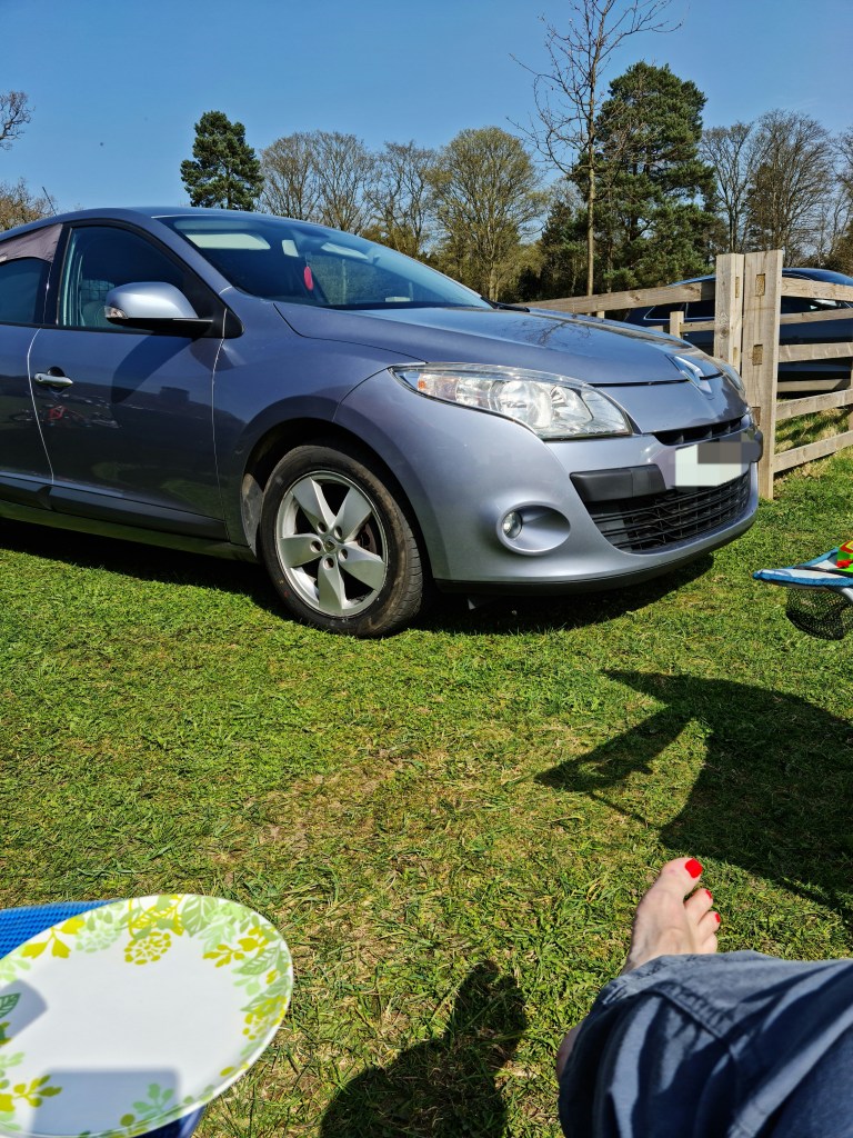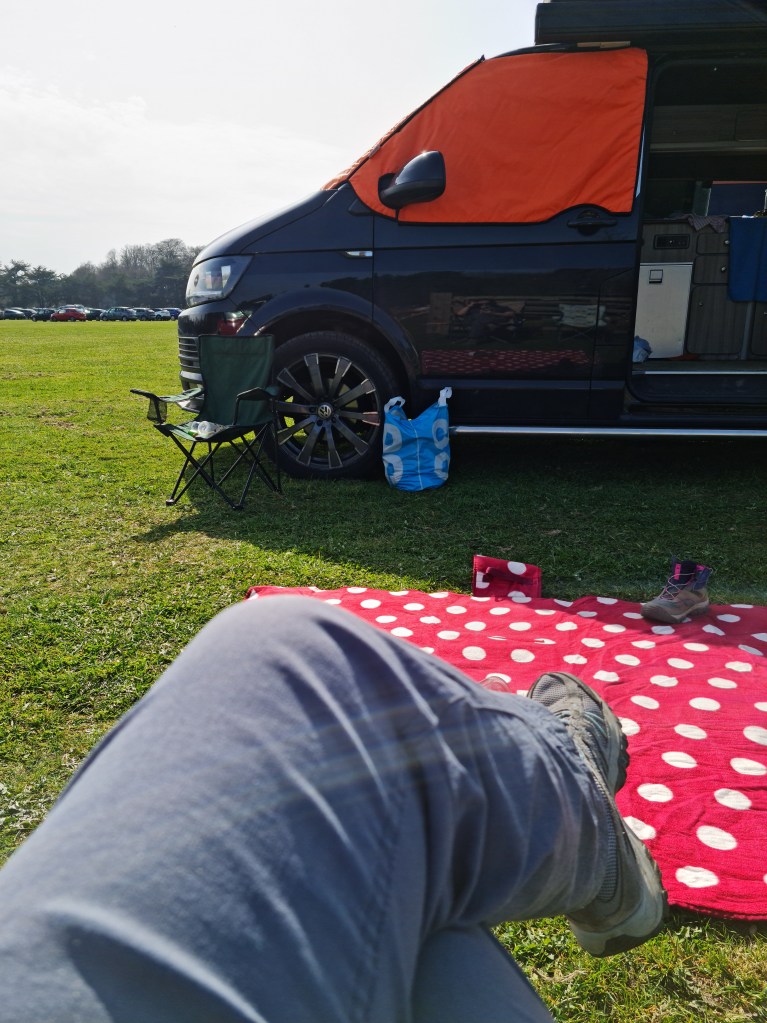 Most of the vehicular masses were parked in neat rows on the right hand side of the field, so we hooked a left across the wide open empty field, past the odd motor home and installed ourselves by a small fenced off tree, leaving a nice 8 or 10 foot gap next to the van to allow room to put out chairs, maybe even wind out the awning. 🌞⛱🪑