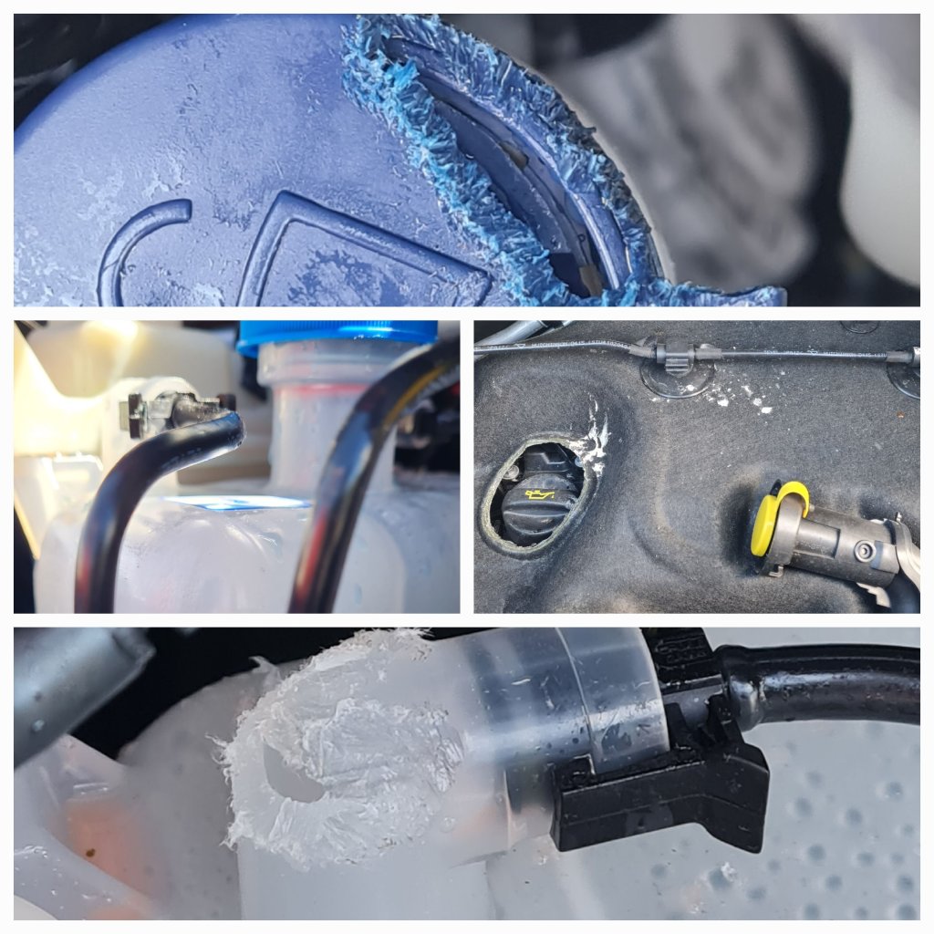 After a good examination he diagnosed a rodent incursion. Apparently coolant tastes sweet, how he knew, I’m not sure. He said it needs a new coolant reservoir and can’t really be driven, if it overheats, the engine is knackered.