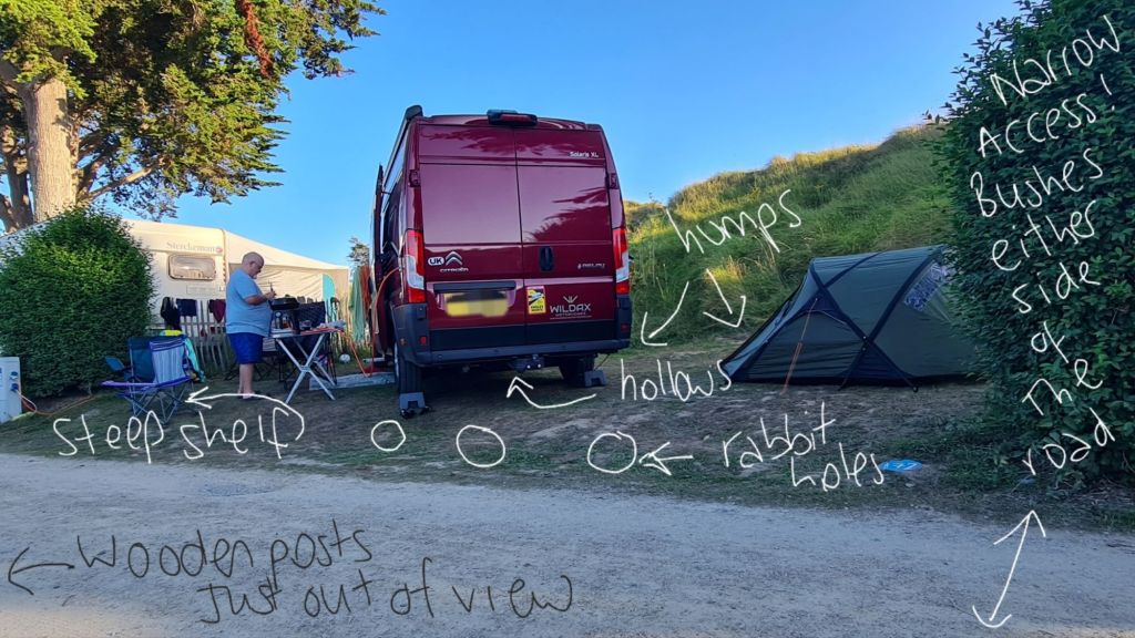 The pitches were marked out with shrubs at the corners, and the roadway was single vehicle width, so we couldn’t turn in easily. The far end of the pitch was shelving, so we couldn’t reverse up without risking the underslung tanks and pipework. There were wooden posts at the far end anyway, which made turning in from that way a no-go. And we discovered it was supposed to be a one-way system.