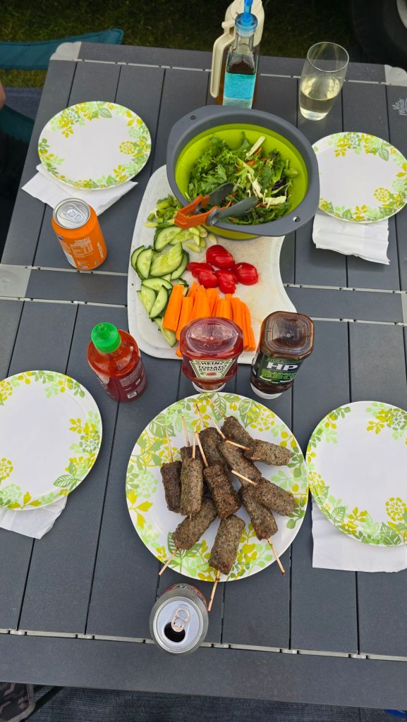 We got the full tour of the facilities on arrival at the camp, which at 25 nicker per night was very acceptable, and the anklebiterz were so befuddled after hours of screen gazing on the road that they actually made themselves useful and helped to peg out the new outdoor carpeting. Of course arguing all the while about who gets to hold the mallet and threatening to fight each other all the while.
