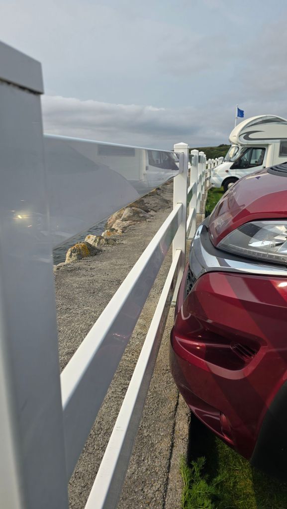Grass pitch – front line of the sea, mind, with electric, wifi if you’re prepared to sit on the bench outside reception, and showers that you have to pay for on top. Vans are crammed in along the plastic fence separating you from the drop onto the rocks, and we had exactly a Bean width between the van and the enormagantic floodlight which was the limit of our spot. Rrrrrrrrrrrrip off.