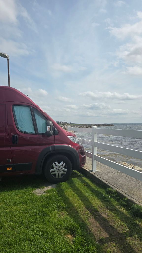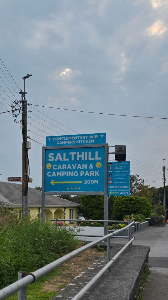 We made it in good time, and turned in to the driveway of Salthill caravan park just before 11, to join the already growing queue of campers.ย When they finally opened the office door, they approached all the campers and informed each one when they could step in to the office.ย It was a long and tedious wait.