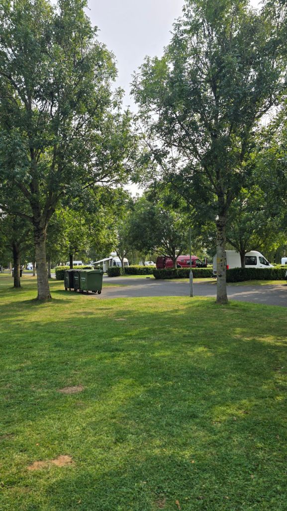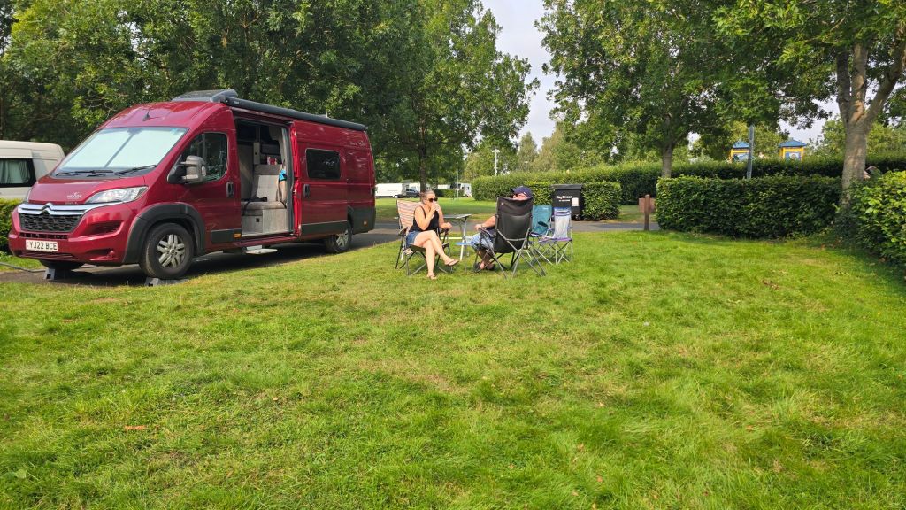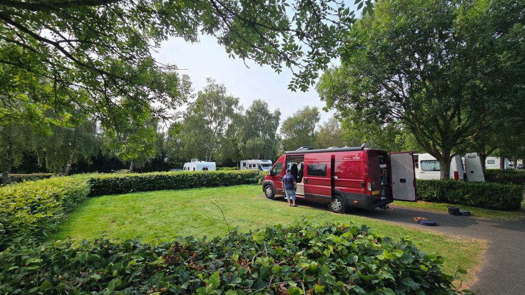 The pitch was gigantic, part hardstanding, lots of grass.ย Hedged all around and easily room for a big awning, big tent and another vehicle, still with room to put your tables and chairs out.ย And our pitch was by no means the biggest on there. KB said he found it very continental, so much so that he almost gave out a round of bonjours when he trotted forth.