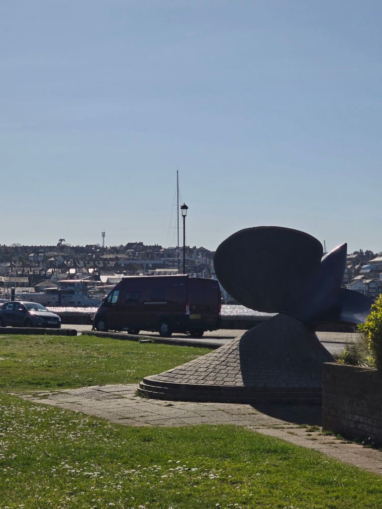 We parked in the long-stay car park next to the Leisure Centre as it was sizeable and we had a good chance of parking the big Red Beast without too much manoeuvering. There was a Scout bus that had aimed for a double space towards the back, so we decided to park alongside. There was a very jolly traffic wench on duty who advised us to make sure the wheels were within the box to avoid a possible penalty and also told us about a tourist parking permit, which, sadly we were a bit too late for to benefit from, but shelled out 3 pound sixty for a couple of hours to allow us leisurely ice cream and beach time.